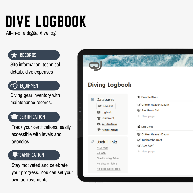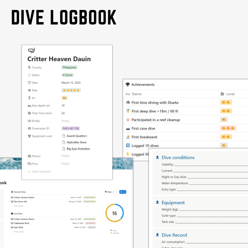 This template is perfect for recreational divers who want a reliable, all-in-one digital dive log that goes beyond paper records.
