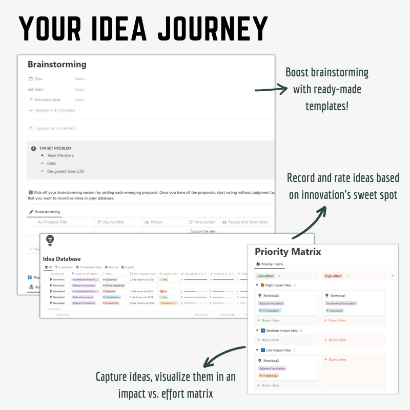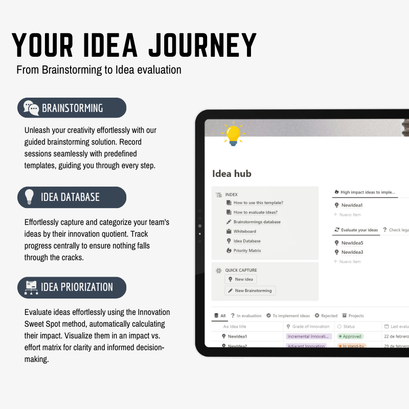 • 💡 Idea Database & Centralized Dashboard: Bid farewell to scattered ideas. Our centralized database and intuitive dashboard keep your ideas organized and accessible, empowering you to track progress and drive innovation effectively.