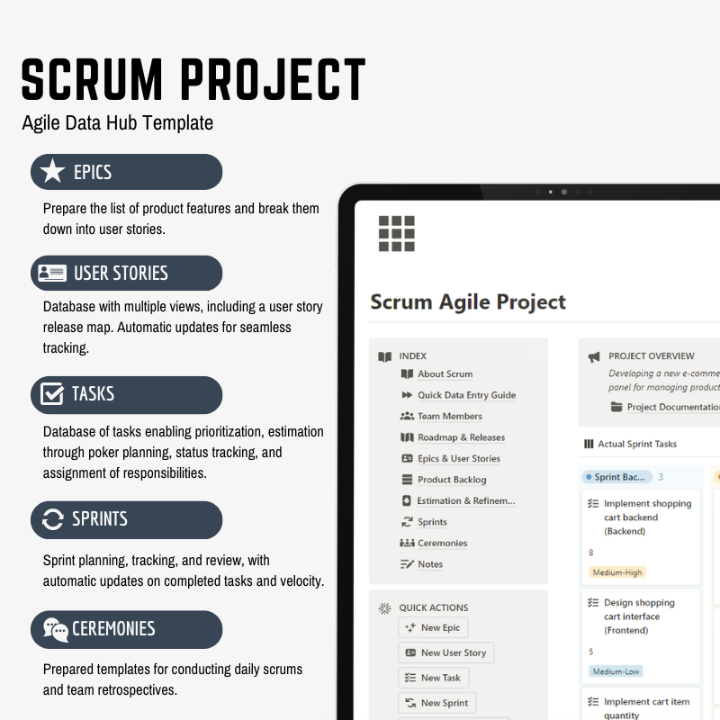 - π Comprehensive Database System: Organize epics, user stories, tasks, and sprints across different databases, all interrelated to streamline your process. Utilize multiple views for each database to display information in the most convenient way.